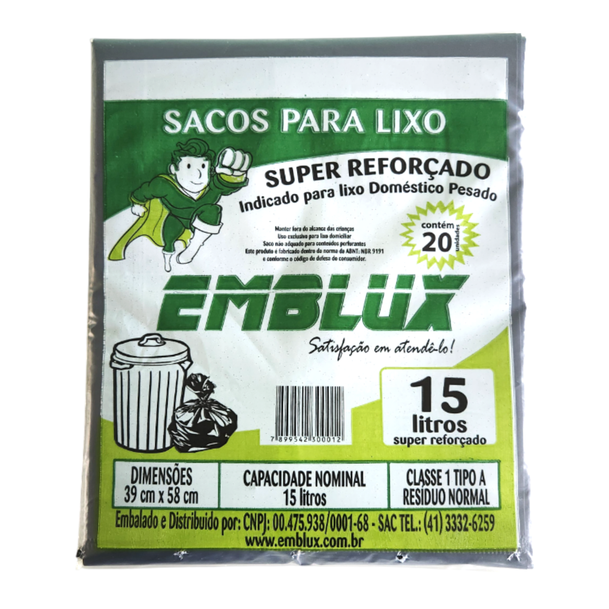 Saco para Lixo Reforçado Emblux - 15 Litros Preto 20 Unidades
